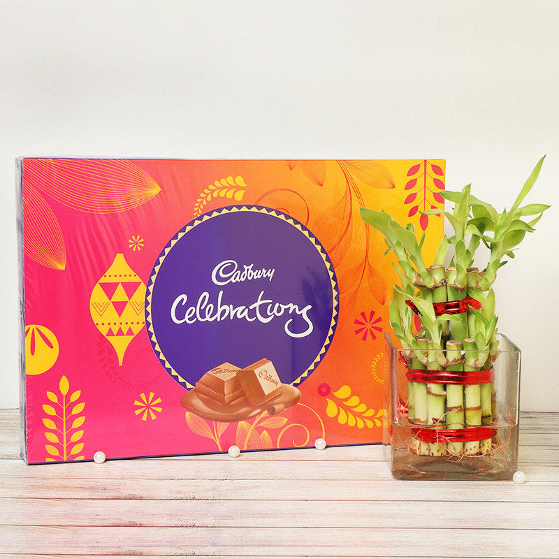 Show your loved one some sweet TLC with this exquisite gift combo of a lucky bamboo tree with the box of delicious cadbury chocolates. They will be delighted to receive it and will have ever growing love in their heart for you. # The lucky bamboo is not really a bamboo. It belongs to the same family as Lily. # It is supposed to bring three kind of luck: Happiness, Long Life and Wealth.
