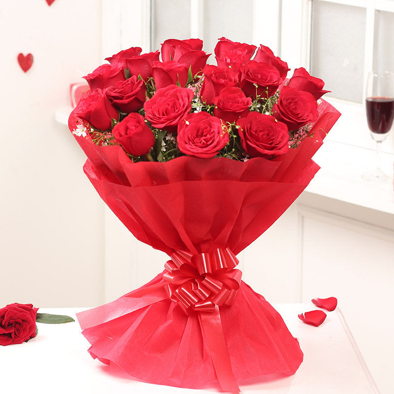 This eye-catching, decorative bouquet consists of 20 bright red roses along with seasonal fillers wrapped in an attractive red imported paper. Surprise your near and dear ones with this beauty today and wish them for a brighter future and good times ahead.