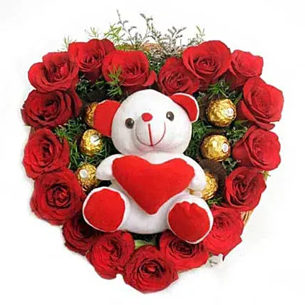 The Truly Yours Rose arrangement is a bright and beautiful way to send your love and affection across the miles!! A gorgeous heart shape arrangement to create an incredible presentation to sweep your sweetheart off their feet. The lovely heart shape arrangement is a wonderful gift that any of the loves in your love will adore. Heart shape arrangement of 17 Red Roses, 16 pieces ferrero rocher chocolates N 6inch cute soft toy with Lot of green fillers.