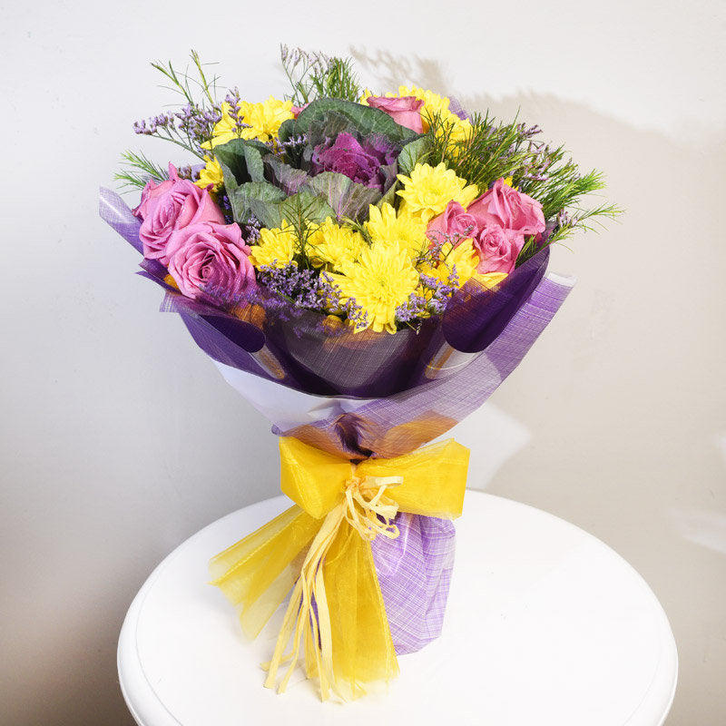 Premium Arrangement of 9 Purple Roses and 1 Purple Brasica